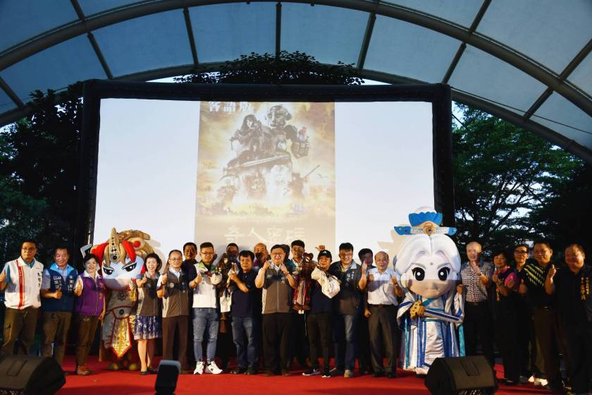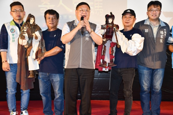桃園市政府客家事務局與財團法人桃園市客家文化基金會製作的「霹靂布袋戲-奇人密碼古羅布之謎客語版」,19日晚間於桃園市平鎮區新勢公園天幕籃球場舉行首映會,本電影是臺灣首創布袋戲電影客語配音版。