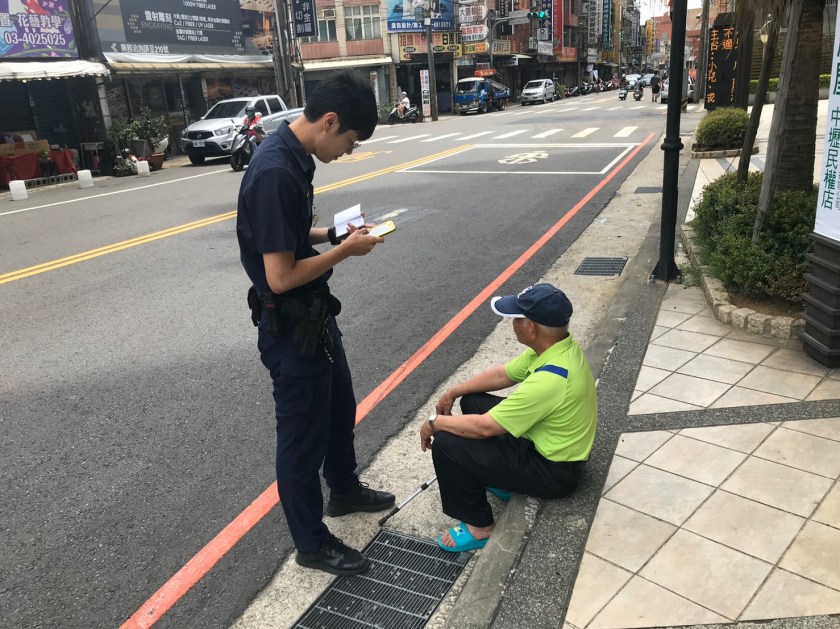 恰巧員警林家賢及莊才煥巡邏經過,見老翁臉色慘白癱坐在路旁,員警趕緊上前關切,發現老翁疑似體力不支,且有輕微中暑脫水症狀,說起話來有氣無力,語意完全無法表達,員警見狀立即前往超商買冷飲讓老翁補充體力,並將老翁移至陰涼處稍作休息。