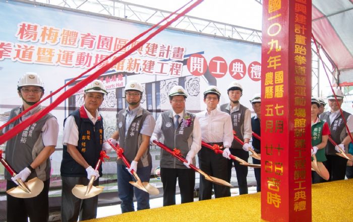桃園市長鄭文燦10日上午前往楊梅區,出席「楊梅體育園區興建計畫—跆拳道暨運動中心場館新建工程」開工典禮。鄭市長表示,為平衡南北桃園發展,及發展楊梅跆拳道特色,市府以約7.2億元工程總經費,規劃興建1棟地下1層、地上4層的跆拳道暨運動中心場館,總樓地板面積約約1萬4,352平方公尺,融合茶花圖騰、綠建築等設計概念,工期650天,預計111年5月完工,打造南桃園多功能活動場館,提供楊梅地區居民體育休閒活動及跆拳道選手培訓競賽的優質場域。