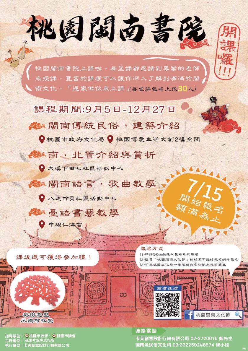 即日起開放報名,歡迎有興趣民眾,一起來閩南書院相互切磋、體驗閩南文化新風貌。名額有限,錯過要等下次機會喔!更多詳情資訊,可至桃園市政府文化局官網