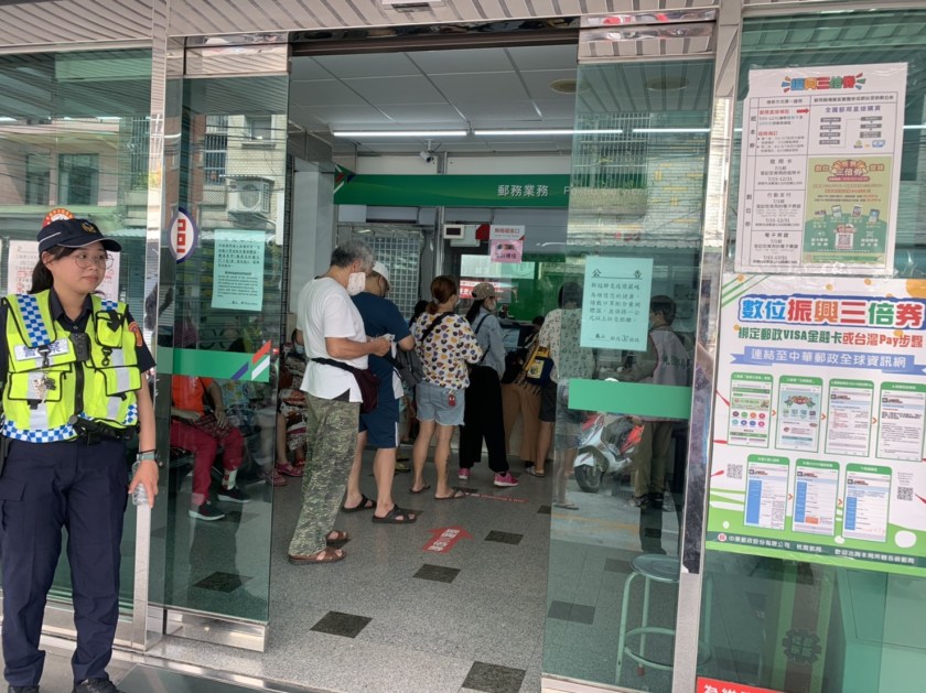 政府振興經濟方案每人發送3000元振興劵俗稱(三倍劵)在民眾殷殷期盼下於15日在郵局、超商等處所領取,第一天是領劵高峰期,龜山警分局避免發生排隊人龍及糾紛,在龜山區八處郵局駐點守望維持排隊人潮秩序,線上巡邏警網落實超商巡簽,防止民眾領取預購劵時發生糾紛,發現郵局領取三倍劵人潮踴躍,反而是超商因為是預購所以只有零星排隊人潮。