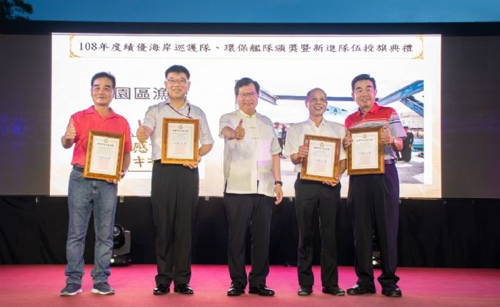 桃園市長鄭文燦25日晚間前往桃園農博環境教育園區,出席108年度績優海岸巡護隊、環保艦隊暨新進隊伍授旗典禮。鄭市長表示,桃園的海洋與海岸資源保護逐漸步上軌道,桃園的海岸線長達46公里,洋流及海風強勁,要進行海岸的垃圾清除非常不容易,感謝環保署、海委會與中央氣象局三個單位共同合作,也感謝各海岸巡護隊及環保艦隊,協助海岸垃圾清理、污染通報及海污緊急處理,共同保護海岸生態與海洋資源,讓桃園的海岸和海洋更健康、更美好,成為推動海洋生態保育的表率。