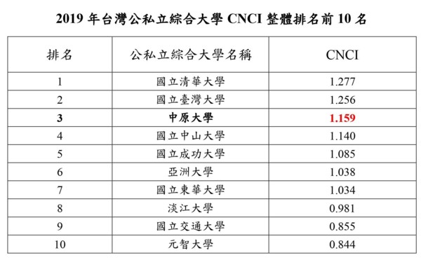 中原大學表示,CNCI (Category Normalized Citation Impact, CNCI)是呈現一所大學在學術研究品質的效度指標,乃依各校在學門領域發表之論文數及論文被引用次數所計算而得。學術研究的世界平均水準CNCI設定為1,大於1即表示該大學或研究機構的學術研究影響力高於世界的水準。經資料分析結果顯示,中原大學整體的CNCI大於1,高於世界平均水平,在台灣的綜合性大學中僅次於清華大學和台灣大學,為全台第3名,呈現出相當優質的論文能量!