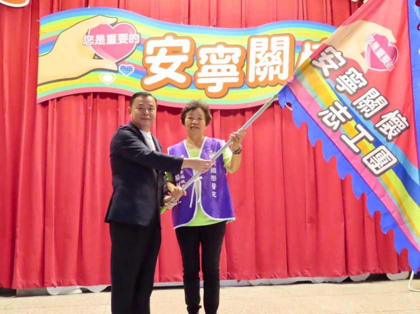 桃園市平鎮區社區營造協會與聯新國際醫院合作辦理的「社區安寧關懷志工培訓計畫」,首創社區安寧志工團,29日在平鎮區獅子林市民活動中心辦理為期2天的培訓課程,由桃園市議會議長邱奕勝為志工團進行授旗,期望能夠培訓更多鄰里志工投入社區,幫助居家安寧的病人及家屬。