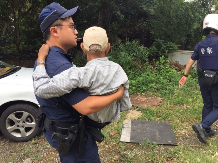 因老翁家中無人,警方不敢大意,硬是在老翁家陪伴老翁等到老翁妻子返家後,才敢離開,老翁妻子返家見狀,得知老翁因體力不支被警察抱回後,嚇的直念「阿彌陀佛」!但隨即也向警方表示感謝,而滿身大汗的警員林庭瑋則靦腆的表示,「沒事就好、安全就好」!