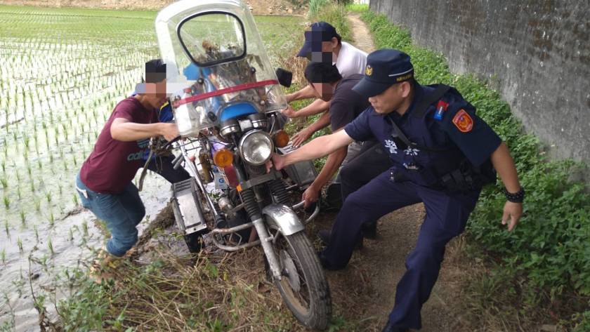 八德區一名游姓男子(約56歲)9日15時許,騎乘機車前往位於田埂間的墓地祭拜祖先時,不小心連同機車跌入泥濘田埂中,八德分局廣興派出所巡佐楊治邦與警員邱淑慎接獲報案後立刻趕往現場,將游男機車抬起助其脫困。