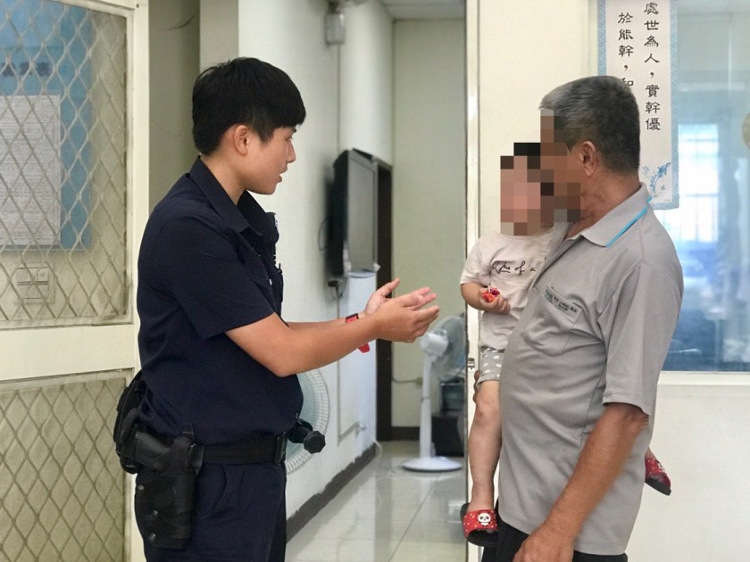經了解,2歲的馮姓女幼童祖父向警方表示,帶孫女到兒童遊戲區遊玩,未料在停車後沒注意到小女童已下車,一時疏忽下才讓孫女走失,當下至附近不斷的尋找,也找不到女童的身影,老翁事後見到有警察到現場,立即揮手呼喊。經警方帶同老翁至派出所時,下車後看見了自己孫女的躺在女警的胸懷裡休息,當下溫馨的場景,讓老翁感動的眼眶泛淚,立即趨前抱回女童,現場由衷感謝警方的即時援助與熱心照護,深表讚許,頻頻向處理的員警鞠躬致謝。