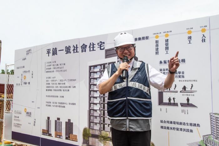 桃園市長鄭文燦18日上午前往平鎮區,視察「平鎮區一號基地新建社會住宅」。鄭市長表示,平鎮一號社宅預計於111年4月竣工,工程總經費約4.7億元,將興建地上12層、地下2層建物,總樓地板面積約2389.29平方公尺,提供一至三房型,合計共64戶,打造小而美的社宅。此外,為了將多元服務引入社宅,平鎮一號將規劃親子館、家庭服務中心、終身服務學習據點、非營利組織據點等多元設施,讓社宅可以發揮更大的服務功能。