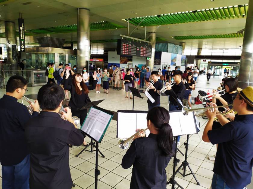 「Let’s Play小號重奏團」經常到桃園市各大校園演奏表演,這次特別來到高鐵桃園站,期盼透過時而嘹亮、時而柔美的各種風格樂曲,將幸福的號聲傳遞到來往的旅客心中,讓民眾體會銅管樂器音色之美,也感受他們對於音樂的熱愛。