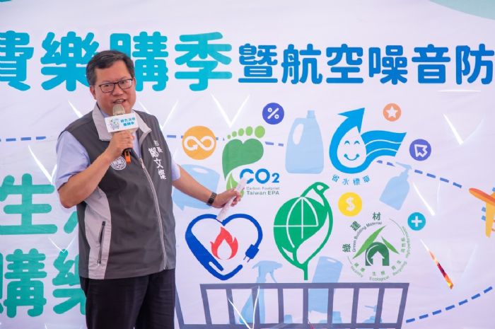 桃園市長鄭文燦23日上午前往竹圍漁港,出席「109年綠色消費樂購季暨航空噪音防制宣導活動」,鄭市長表示,綠色消費樂購季活動往年都在賣場舉辦,今年除了在竹圍漁港舉辦,8月29日在大園區老人活動中心、8月30日在軍史公園也將舉辦樂購季戶外宣導活動,推廣綠色消費的觀念,也能提供市民朋友便宜購買環保標章商品、採購當地農漁產品,響應吃在地、吃當季的食農文化,用行動愛地球。
