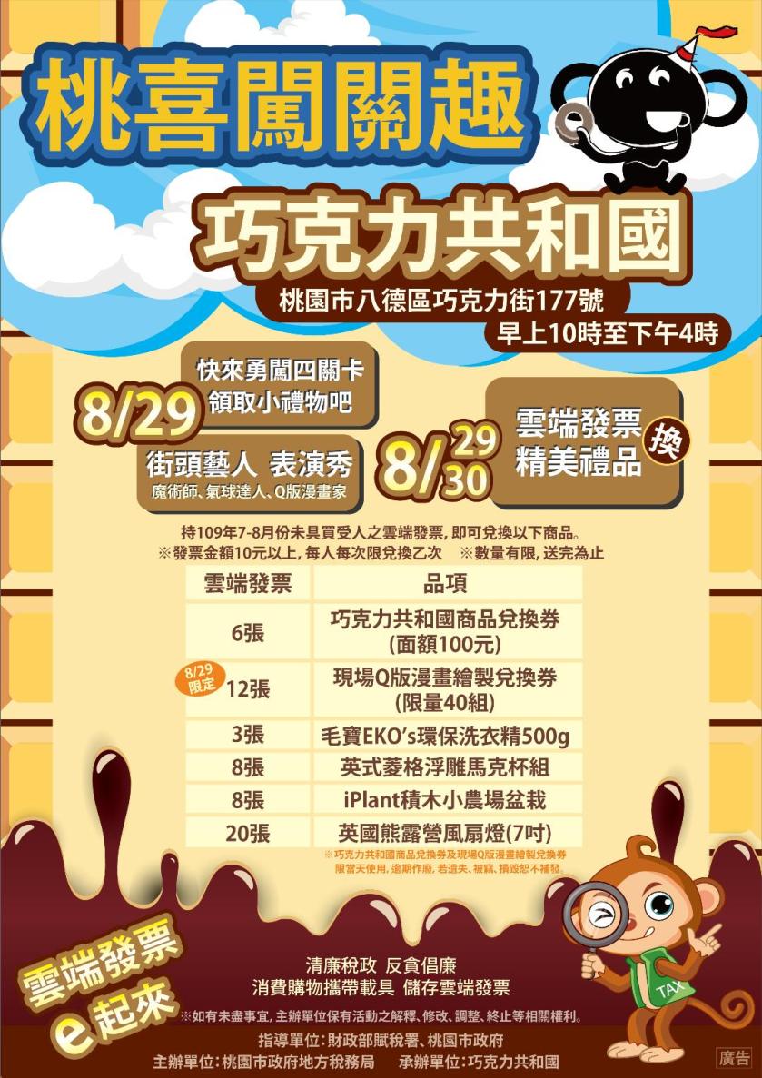 稅務問題霧煞煞?超難懂?桃園市政府地方稅務局於109年8月29日(星期六)上午10時至下午4時,在巧克力共和國(Republic Of Chocolate)舉辦「桃喜闖關趣 ROC冒險記」活動,透過輕鬆、有趣的闖關遊戲,培養「巧」妙「克」服租稅難懂的超能「力」,歡迎大朋友、小朋友一同參與。