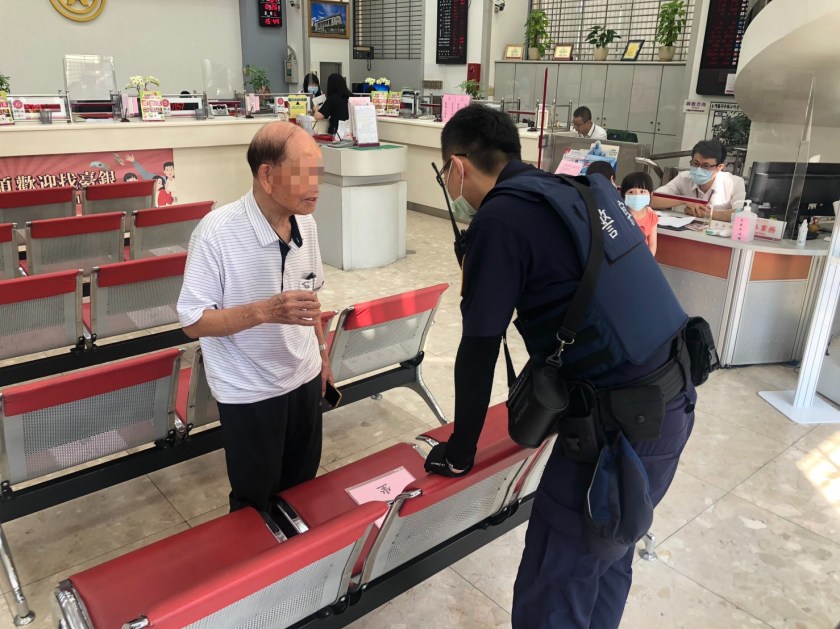 恰巧警員洪偉倫及陳宇邦巡邏經過,發現坐在一旁的老翁眼神徬徨無助,明顯不像是來銀行洽公的民眾,詢問行員才知道原來老翁已經自己一個人坐在椅子許久,員警趕緊上前詢問,無奈老翁重聽,且無法清楚表達語意,員警只好先將老翁帶回派出所安置休息。