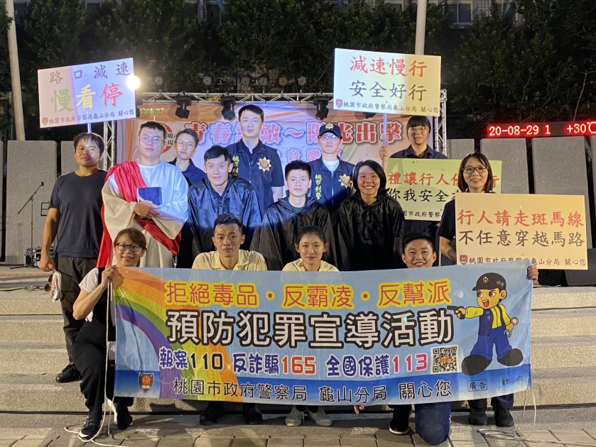 龜山分局偵查隊執行暑假青春專案期間宣導青少年反毒、反詐、反幫派犯罪預防宣導,而反毒話劇團成軍四天,由偵查隊新進同仁校園反毒尖兵擔綱演出,以藥頭侵入校園誘惑愛玩學生,透過同儕合力抗拒新興毒品(搖頭丸、毒咖啡包、神仙水),警方現身即時抓住搖頭等劇情,以淺顯易懂方式,提醒民眾注意防範不要亂喝來路不明的飲料及藥品。