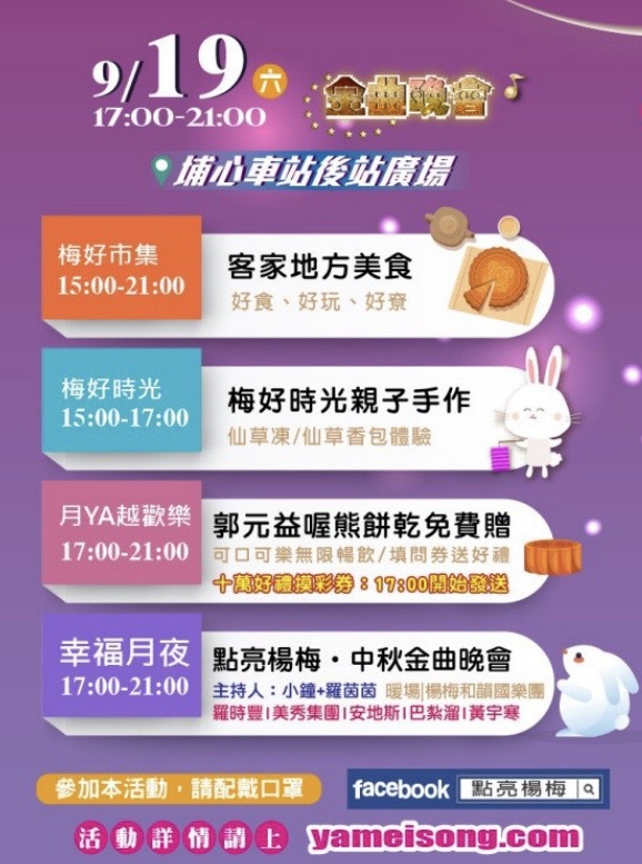 楊梅區今年中秋系列活動壓軸場「幸福月夜 點亮楊梅-中秋金曲晚會」將於9月19日在埔心車站後站廣場登場,今年卡司陣容堅強,特別以國、台、客、原多元族群融合風格的群星演唱,滿足不同年齡層觀眾的喜好,19日下午3點另規劃楊梅在地應景「仙草凍」、「仙草香包」體驗活動,讓民眾藉由手做DIY活動,領略楊梅在地文化之美。