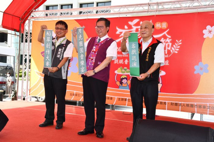 桃園市政府客家事務局與財團法人桃園市客家文化基金會17日於桃園市政府前廣場舉辦「2020桃園客家文化節」記者會,桃園市長同時也是財團法人桃園市客家文化基金會董事長鄭文燦宣布,「月光團圓音樂饗宴」、「客戲巡演」、「稻草創作大賽」3大系列活動正式開跑,透過精彩不斷的活動,發揚桃園客家特有的文化風情,歡迎大家到桃園樂遊客庄!