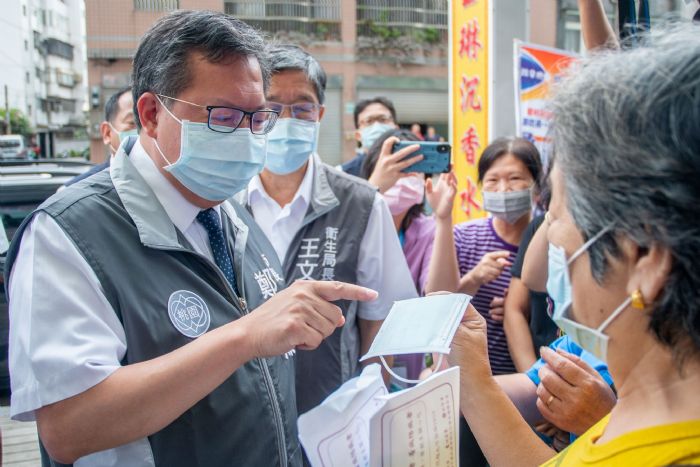 桃園市長鄭文燦24日上午前往桃園區佑您康聯合藥局,訪視MD MIT雙鋼印實名制口罩販售情形。鄭市長表示,為確保國產口罩品質,並使國人快速明確辨識所選購的醫用口罩是否為國產,中央流行疫情指揮中心已宣布自今日起,實施國產製作的平面醫用口罩必須在口罩邊緣1.5公分以內,標示大於0.4公分的「MD」及「Made In Taiwan」字樣。至於9月23日(含)前國內合法生產的平面醫用口罩,可持續販售至今年12月24日,並自12月25日起只有雙鋼印的口罩或經衛生局驗章的國產平面醫用口罩才能販售。