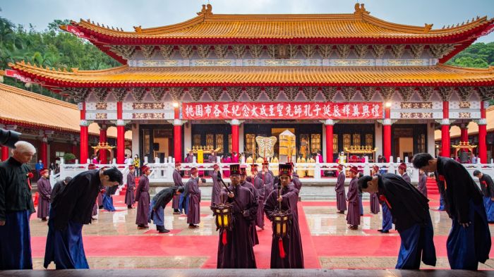 包括現任及退休國中小校長、主任、老師,以及擔任禮生及樂生的桃園高中學生,共計250人組成,其中多位校長已執事超過30年,不但以身教貫徹儒家文化精神,也透過儀典表達對先聖先賢的崇敬感念,傳承大成至聖先師代表的儒家傳統。
