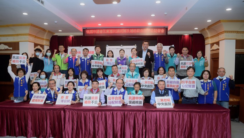 桃園市議會國民、民進、無黨聯盟三黨團30日聯合召開記者會,三黨議員過半出席,抗議中央長期漠視桃園,齊聲高喊統籌補助不公口號,強烈要求中央盡速修法重新調整,公平合理分配財源。