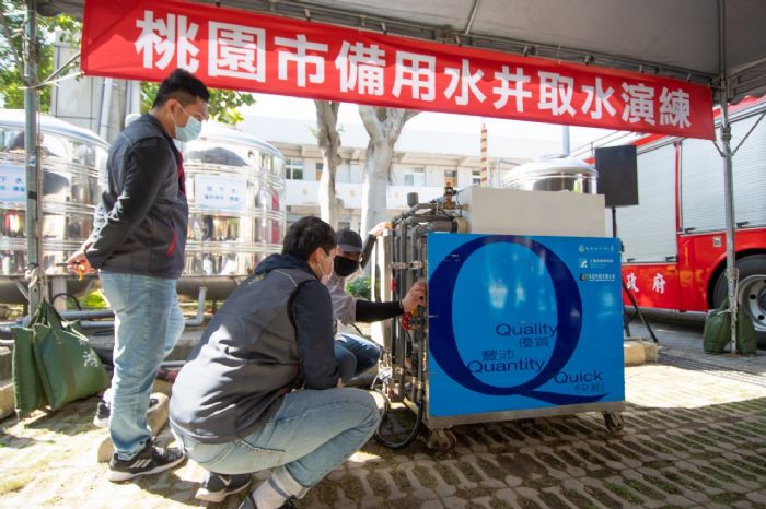 桃園市長鄭文燦4日上午前往龜山區,視察龜山區公所備用水井取水演練。鄭市長說,今年全台沒有颱風過境,目前石門水庫有效蓄水率約49%,仍處於低點,市府與經濟部水利署、自來水公司等相關單位多方合作,啟動多項備援計畫。本次演練由區公所展示民眾透過水龍頭取水,再配合消防局水車接管取水,最後由水利署運用Qwater移動式緊急淨水設備,透過兩道薄膜處理與紫外燈管殺菌淨化地下水,經淨化後的水質符合飲用水標準,能確保未來水情若進入分區供水階段時,民生用水仍能供應穩定。