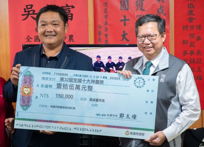 桃園市長鄭文燦24日上午前往平鎮區,拜訪桃園青農吳成富時表示,恭喜他獲選農委會舉辦的第32屆全國十大神農獎,今日特地前來祝賀,並致贈資材補助金15萬元,勉勵青農吳成富繼續創新發展農業,並傳承相關經驗,成為青農典範,帶領桃園青農往前衝。