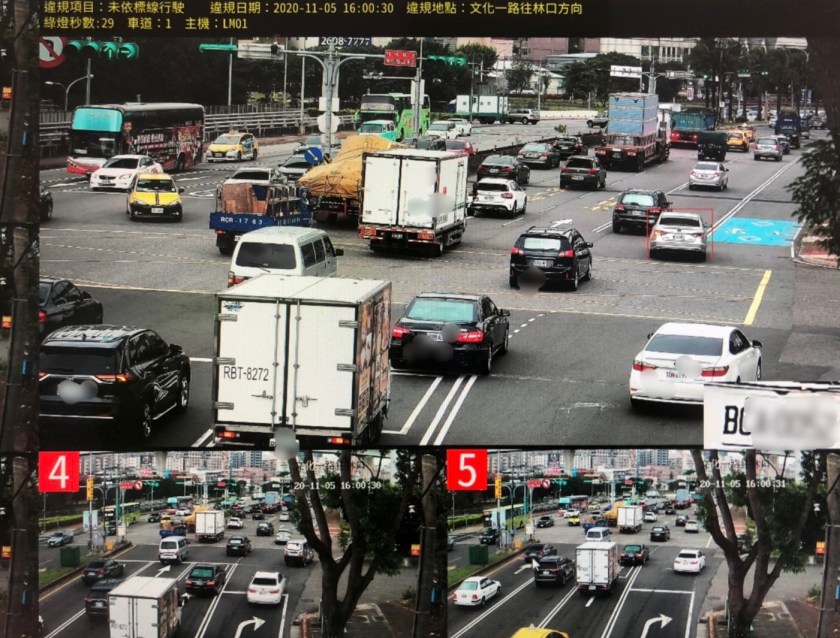桃園市政府交通局於桃園市龜山一路與文化一路口建置高科技執法監錄系統,照相取締違規車輛,交通執法自11月2日起截至11月30日,違規樣態未依標線行駛共計16,180件,闖紅燈164件。交通違規行為以10天計算數據如下: