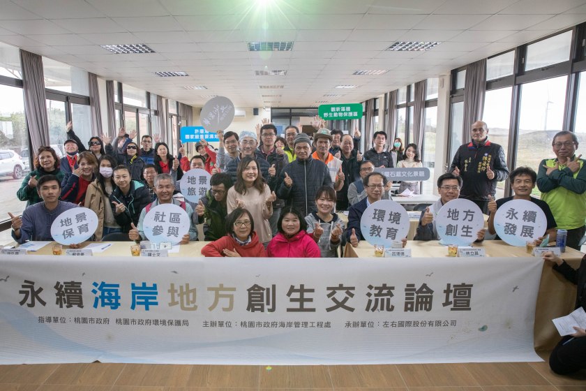 永續海岸地方創生交流論壇,包括桃園市議會陳姿伶議員服務處林金來主任、中華經濟研究院能源與環境研究中心李永展研究員、高雄市援剿人文協會陳士文理事長、台灣繪本美術館蘇俊豪博士、伯公下在地文化發展協會許弘霖總幹事、中央大學環境教育研究中心李宗勳老師、黑松教育基金會副組長管宇貞、桃園市解說員職業工會邱標鎮理事長、桃園市大園環保協會卓玉珠理事長、桃園市新屋區愛鄉協會李仁富理事長、桃園石滬協會張明和先生、桃園市政府環保局呂理德局長、桃園市政府海岸管理工程處林立昌處長等均出席與會。