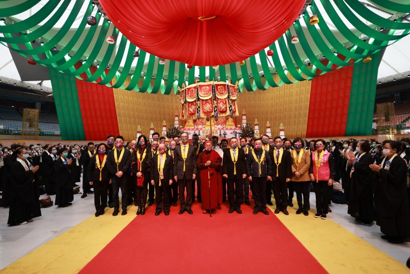 下午1點30分,貴賓陸續抵達桃園巨蛋水陸法會,先在富貴金佛前獻花供佛,隨後與心道法師短暫會晤,再一起進入莊嚴的水陸內壇供燈祈福,侯友宜市長念誦祝禱文,誠心祈願疫情消弭、災難遠離、百業興旺、經濟繁榮、善信大德吉祥安康,祈求風調雨順、地球平安。