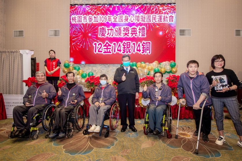 桃園市長鄭文燦26日午間前往中壢區,出席「109年全國身心障礙國民運動會頒獎典禮」時表示,桃園市代表隊共164名選手及隊職員參與本屆賽事,共計奪得12面金牌、14面銀牌、14面銅牌,並在田徑及射箭項目蟬聯9項金牌,破2項全國紀錄及1項大會紀錄,獲得全國第七名佳績,市府共頒發462萬4,000元獎金,為身障選手優異的表現喝采。鄭市長也說,未來將持續打造桃園成為有愛無礙社會,鼓勵身障朋友在各領域展現才華。