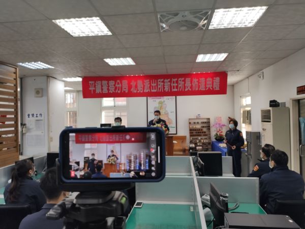 桃園市政府警察局平鎮警分局20日舉行北勢派出所新任所長布達儀式,由分局長李建民親自主持,由於疫情險峻,本次布達儀式首創以線上直播方式進行,各界人士均在線上觀禮,並期許新任所長能延續好的表現,繼續維護地方治安與交通。