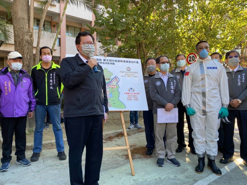市長鄭文燦表示此次第6軍團是由上校指揮官龔龍峰擔任帶隊官,支援人力及器具與市府環保局共同針對桃園醫院周邊社區進行消毒,市府將與中央全力配合加強防疫等級,呼籲民眾落實前往八大場所佩戴口罩維持手部衛生、保持社交距離等個人衛生習慣,並加強宣導餐飲業、化妝品專賣店暫停試吃、試用等服務,以減少傳播風險,全民齊心抗疫。
