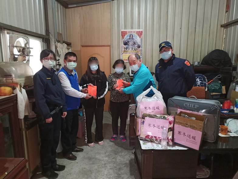 歲末寒冬,新年將至,龜山警分局坪頂派出所所長陳均百與坪頂所警友站站長陳文昌邀集地方善心人士共同募集愛心物資,於今日上午帶著慰問金、愛心物資等物品,關懷社區邊緣家庭,給予弱勢族群寒冬中送上一份溫暖,其中一位高齡90歲的廖老奶奶年邁無謀生能力,卻又須照顧癱瘓20多年的70歲兒子,平日都靠市政府和民間善心人士的幫忙來維持生活,今天收到了這些暖暖的愛心物資,心懷激動的向慰問善心人士道謝。近日疫情升溫,所長陳均百也趁此寒冬送暖之際,致贈防疫物資口罩及酒精,提醒及宣導防疫的觀念,希冀能夠透過警方的關心來讓民眾感到安心。
