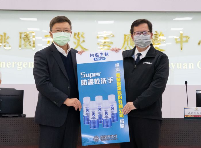 臺鹽實業股份有限公司董事長陳啟昱表示,桃市府嚴謹面對疫情,臺鹽公司於此關鍵時刻,捐贈臺鹽公司生產的1萬瓶防護乾洗手,表達支持和關懷之意,希望所有防疫同仁在防疫過程中都能保護自己,臺鹽公司也會繼續做桃園防疫最大的後盾。