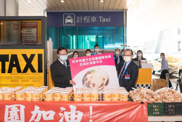 桃園市長鄭文燦4日下午前往桃園國際機場,視察機場防疫計程車防疫作為。鄭市長表示,桃園位於防疫第一線,國境防疫尤其重要,本市防疫計程車原本僅接送桃園居家檢疫者就醫服務、移動防疫地點等接駁服務,今(110)年1月擴大服務範圍至鄰近新北市、新竹縣等縣市,也將居家隔離者及自主健康管理者納入服務對象。防疫計程車隊徹底落實乘客、旅客行李及車輛消毒作業,不僅保護駕駛及乘客安全,也確保桃園救護車能量。今日結合許多公益團體帶了600份人蔘雞湯、1200顆茶葉蛋來為慰勞防疫車隊司機的辛勞,感謝他們提供安全的載送服務。
