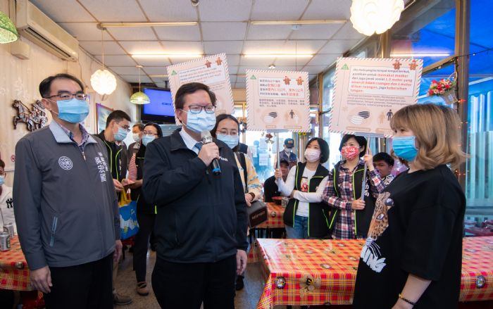 桃園市長鄭文燦7日中午前往桃園區,視察移工朋友常去的餐廳、店家時表示,防疫不分彼此,外籍移工們來到桃園,就是我們的一家人,而桃園後站有許多餐廳、百貨商場、小吃店、服飾店、理容院,是移工朋友工作之餘常去的場所,在防疫期間,市府致力於關注移工健康,故要求桃園各餐廳持續落實各項防疫措施,避免成為防疫的缺口,包括入口處張貼越南、菲律賓、印尼及泰國等多國語言版本的防疫宣導海報,並配合量測額溫及維持社交距離,相信防疫做得好,移工朋友們也能安心工作生活、享受美食。鄭市長也祝福移工朋友們在桃園快樂迎新年。