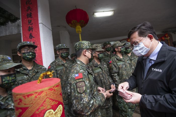 鄭市長親自發放牛年福袋給每一位值勤同仁,代表全體市民表達對國軍的感謝之意,並祝福陸軍第六軍團、三三化學兵群及所有國軍弟兄春節平安快樂。