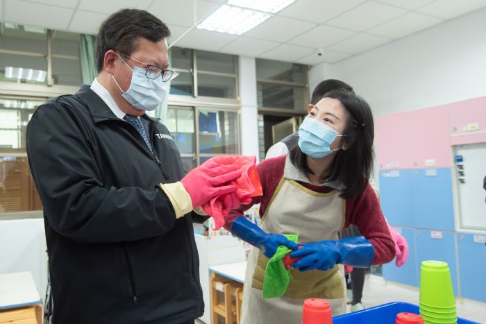 桃園市長鄭文燦20日上午前往桃園區青溪國小及其附幼,視察學校及幼兒園開學前防疫整備工作。鄭市長表示,高中職以下各級學校及幼兒園將於2月22日開學,各校已整備好相關防疫措施及防疫物資,待今日青溪國小及觀音高中消毒工作結束,全市363家私立幼兒園、36家非營利幼兒園及340所高中職以下學校的校園環境消毒工作全數完成,感謝環保局同仁與國軍33化兵群的協助,共出動約600人次,在一個星期內完成全市所有校園環境消毒作業,消毒人員利用濃度1,000ppm漂白水進行消毒,確保桃園的孩子們擁有安全乾淨的學習環境,健康迎接新學期。