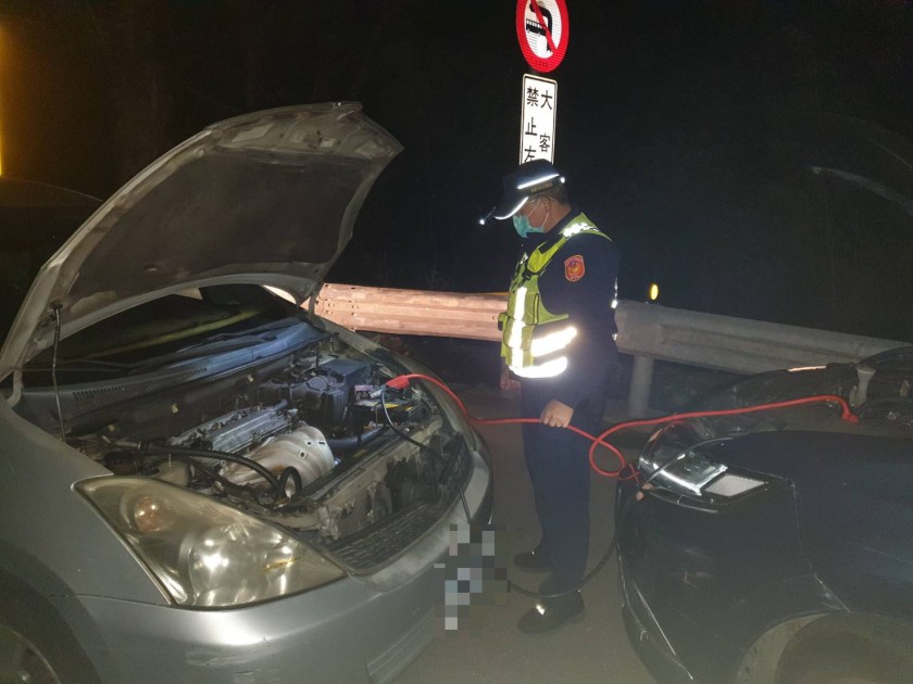 家住復興區的陳姓民眾(男、51歲),與其妻兩人要返回拉拉山住家,19日21許行經桃園市復興區台7線32.6公里處附近時,因前面道路山坡坍方落石進行交通管制,兩人停於路旁等待時車燈未關就睡著了,於22時許醒來時,因電瓶沒電車子發不動,大溪分局榮華派出所警網當時執行交通管制勤務,立即前往關心,並以巡邏車電瓶接線供車輛接電,協助陳民將車輛發動,讓其能順利返家。