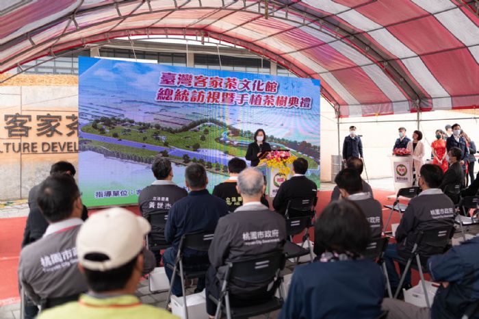 總統蔡英文表示,龍潭是茶產業的重鎮,擁有悠久歷史與文化,茶葉在桃園也有綠金產業的美名,希望未來透過台灣客家茶文化館將茶產業再次行銷出去。蔡總統也說,在桃園市政府團隊高效率執行下,台灣客家茶文化館進度超前,即將完工啟用,令她非常開心。