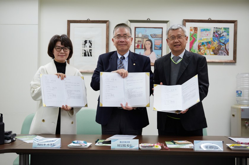 華聯生技楊桂華董事長(左)、中央大學周璟揚校長(中)和聯新國際醫院張煥禎總院長(右)三方共同締約。