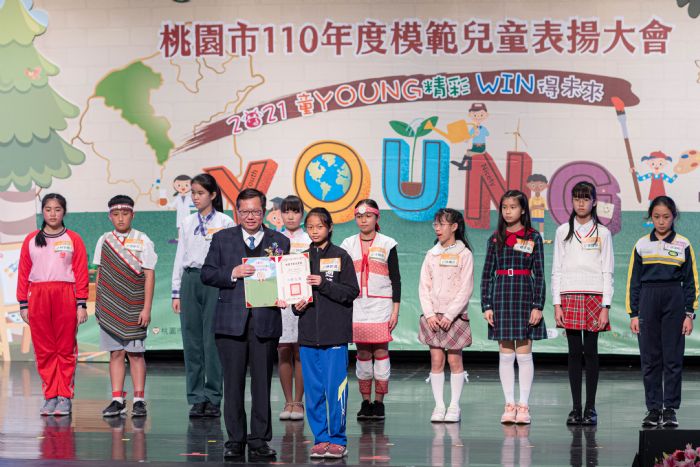 桃園市長鄭文燦24日下午在教育局長林明裕、桃園區長陳玉明陪同下前往桃園展演中心,出席「2021 童YOUNG 精彩 WIN得未來」桃園市110年模範兒童表揚活動時表示,今(110)年度的模範兒童表揚大會以「年輕活力」(Young)、「心胸開放」(Open mind)、「積極樂觀」(Upbeat)、「優雅美好」(Nicety)、「心懷感恩」(Gratitude)5個主題字首組成「YOUNG」的主題,象徵模範兒童所具備的生命品格,也展現年輕、活力及未來的希望。