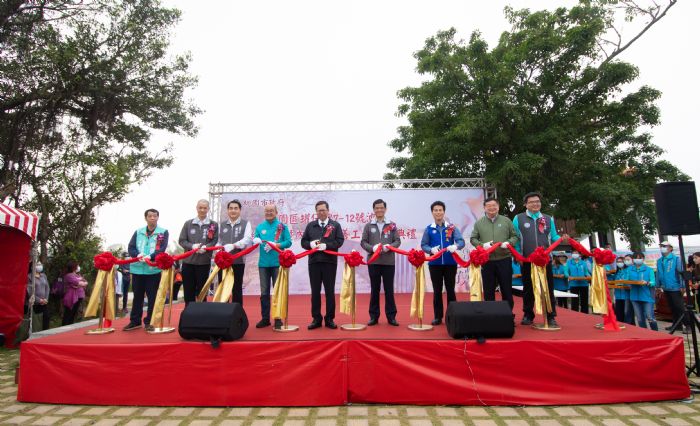 大園區長徐藍科表示,「罐仔埤7-12號池周邊綠美化暨內面工改善工程」內容,包括拆除既有埤塘內面護岸及給水塔,新設溢水口、堤頂環埤PC景觀步道、擋土牆及3座觀景木棧平台,步道除了有扶手欄杆外,景觀燈、入口意象及植栽綠美化也一併完成。
