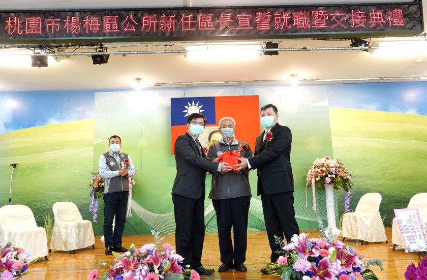 楊梅區新任區長邱世源(右一)宣誓就職交接典禮,高安邦副市長(右二)擔任監誓人及主持人、民政局陳靜航局長(左一)擔任監交人。