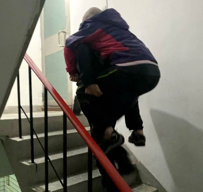 員警協助將其送返住家公寓(無電梯),但老先生因為太累,剛登上5級階梯就無力再走,陳員一把扶起老先生,將他揹回5樓家中,老先生很感動,頻頻向員警道謝,員警叮嚀他若有問題可聯繫相關單位協助,以避免發生危險。