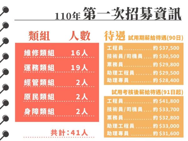 在去(109)年疫情嚴峻的考驗下,桃園捷運公司展現韌性,堅守崗位並持續穩定維運,隨著今(110)年度隨著疫情趨緩,國內旅遊逐漸復甦,桃捷公司將進行110年度第一次人才招募,此次招募維修類16名、運務類19名、經營管理類2名、原住民類2名及身心障礙類2名,共41個名額,其中,經管類工程員起薪約4萬1千元。桃捷公司重視營運安全及穩定捷運系統,積極投入軌道專業人才培育,提供旅客安全、可靠的捷運服務,歡迎相關從業人員、或相關科系畢業生踴躍報名,共同直達美好的桃園捷運大家庭。