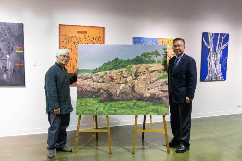藝術家李文謙(左)捐贈畫作「清淨如水」給中央大學典藏,由中央大學校長周景揚出席代表接受(右)。