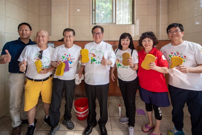 隨後鄭市長也與徐重仁理事長一起清掃廁所,並在協會的協助下,使用不污染環境的清潔劑,配合步驟以環保省水的方式完成清潔工作。