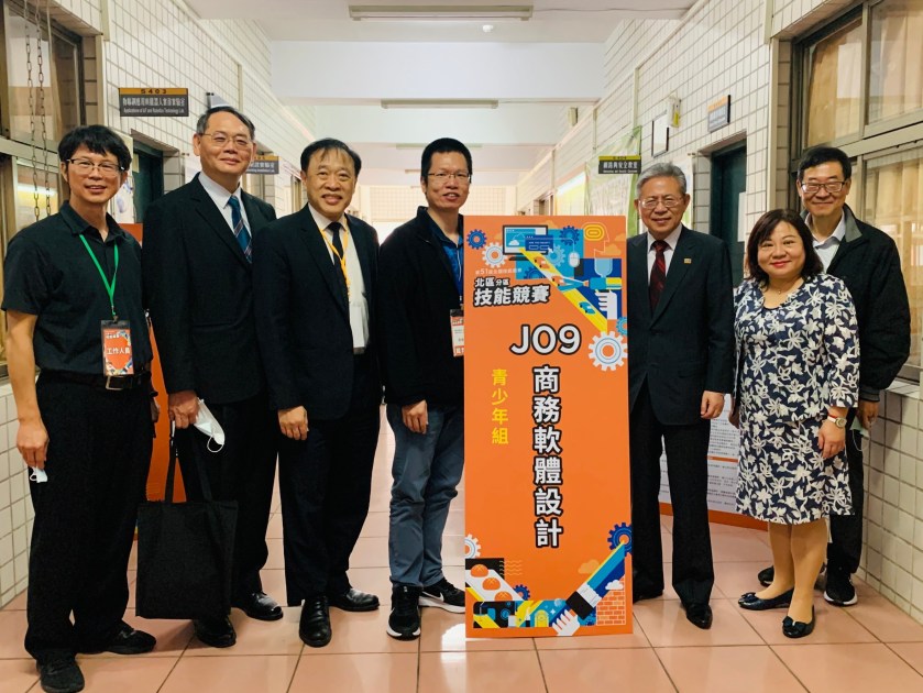 勞動部林三貴次長(右3)及勞動力發展署施貞仰署長(右2)關心競賽選手比賽,特別前往設於萬能科大的競賽場為選手打氣加油。