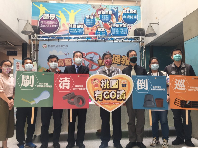 為提升醫療院所登革熱通報警覺及加強民眾清理孳生源意識,桃園市政府衛生局於(26)日辦理「提高警孓 加強通報」登革熱衛教宣導記者會,鑑於109年度本市登革熱通報數為314例,確診30例,其中23例為本土登革熱個案,本土個案中有12例為衛生單位主動發現、11例由醫療院所通報發現,突顯加強通報之重要性。另為感謝本市醫療院所機警通報,於記者會現場頒發感謝狀予109年度主動通報並發現登革熱確診個案之醫師,感謝其迅速發現確診個案以利本局即時介入防治措施,共同攜手防範登革熱;活動中亦藉由衛生局防疫人員示範「巡、倒、清、刷」步驟,衛教民眾定期檢查住家周圍環境,落實環境整頓及容器減量以預防病媒蚊孳生。