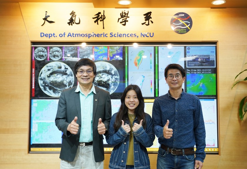 中央大學大氣系研究顯示,空氣污染改變了桃園的降雨特徵。照片左起大氣系林沛練教授、陳映潔同學,以及指導教授王聖翔老師。