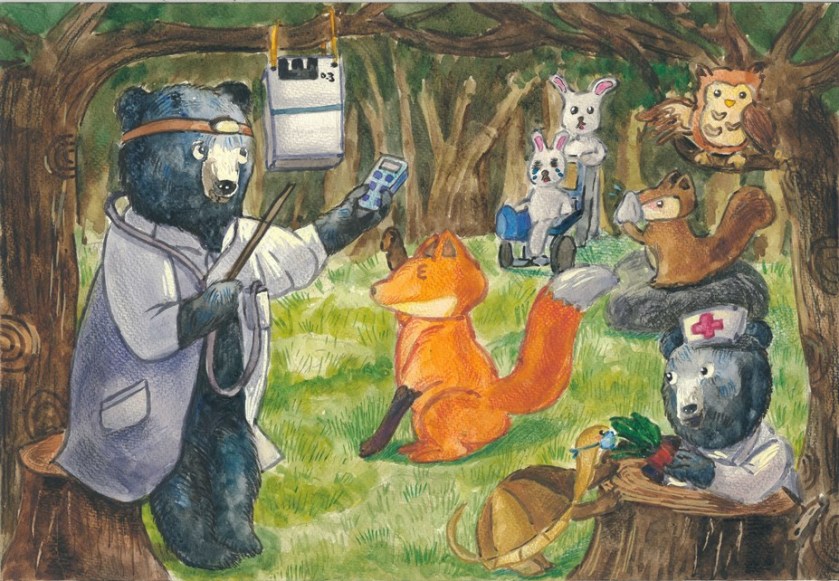 第三組「國小4~6年級組」特優 李梓瑈-黑熊醫生,以擬人手法表現醫生的角色,畫面水彩技法表現水準之上。